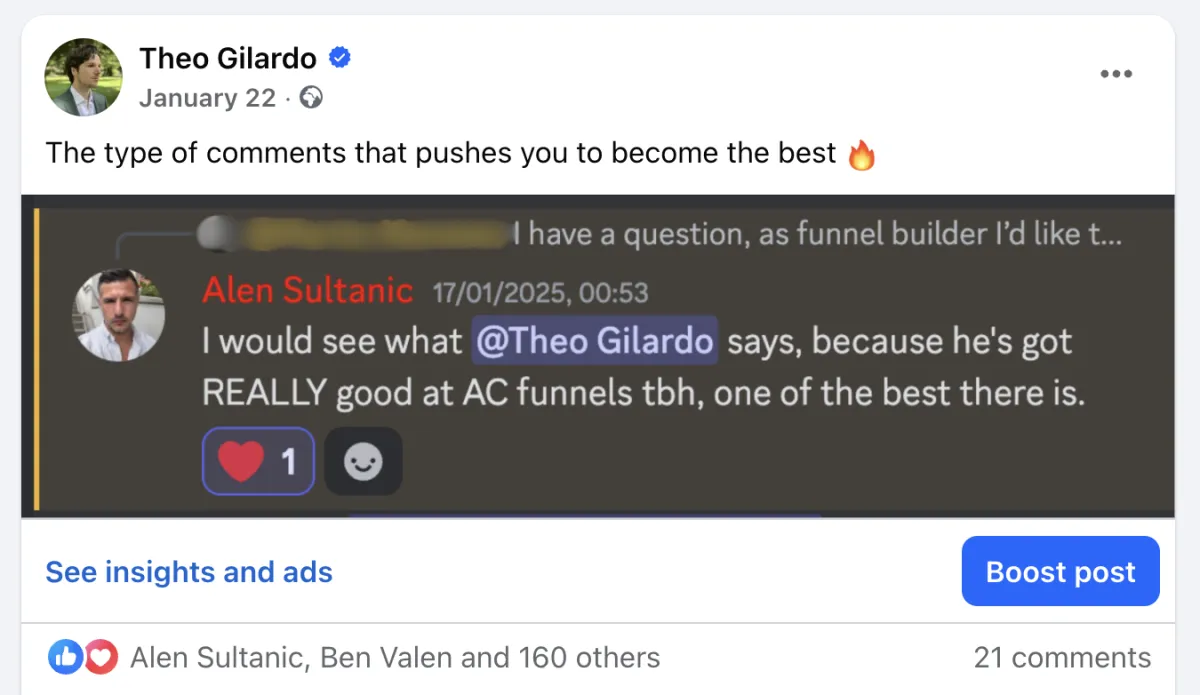 My name is Theo Gilardo, and after launching 20+ low-ticket offers that helped my clients generate $1M+ on cold traffic and being personally mentored by Alen Sultanic (the genius behind the $1B+ "Automatic Clients" AC model). Here's what he says about me: